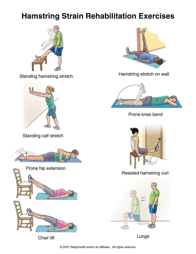 • Standing hamstring stretch: Place the heel of your injured leg on a stool about 15 inches high. Keep your knee straight. Lean forward, bending at the hips until you feel a mild stretch in the back of your thigh. Make sure you do not roll your shoulders and bend at the waist when doing this or you will stretch your lower back instead of your leg. Hold the stretch for 15 to 30 seconds. Repeat 3 times.